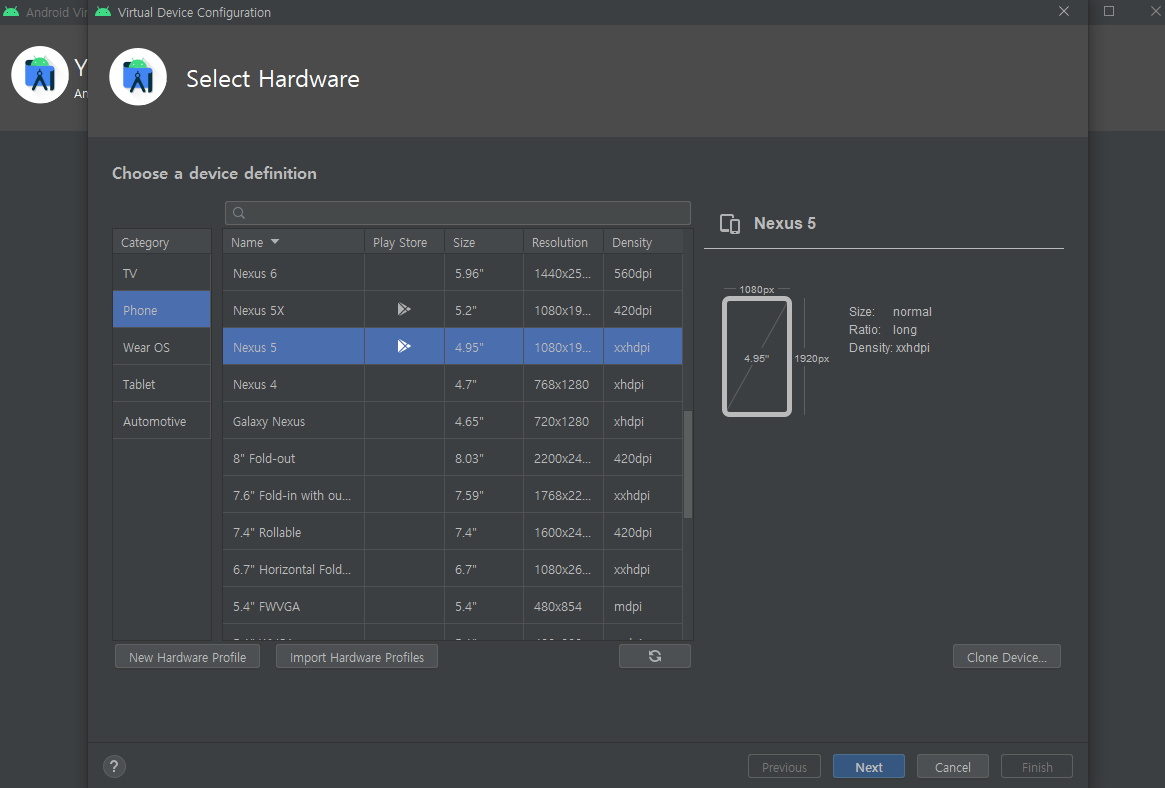 Phone -> Nexus 5 -> Next