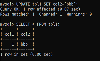 값 변경 : UPDATE tbl1 SET col2='bbb';