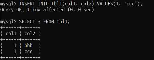 테이블에 행 삽입 : INSERT INTO tbl1(col1, col2) VALUES(1, 'ccc');