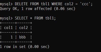 삭제 : DELETE FROM tbl1 WHERE col2 = 'ccc';