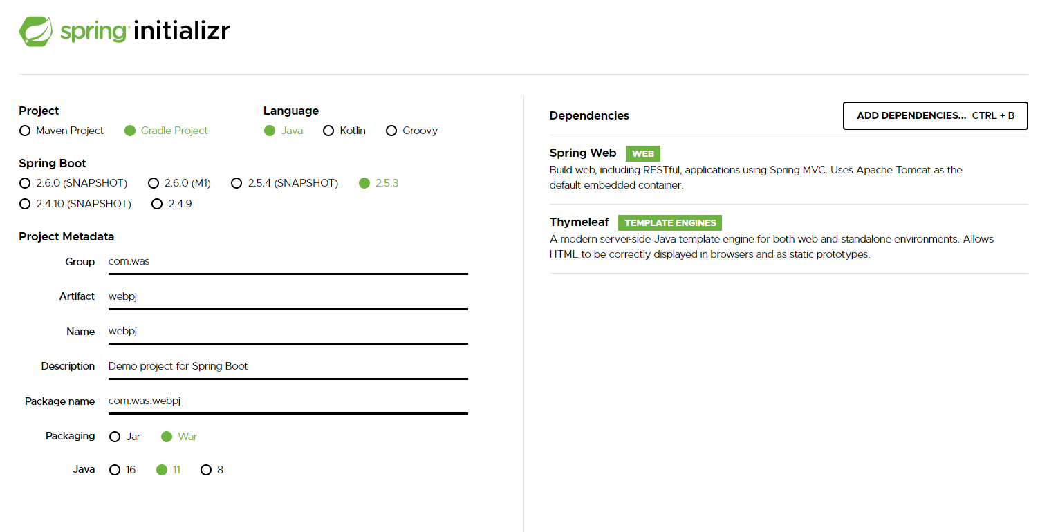 Dependencies : 어떤 라이브러리를 쓸건지 선택 후 Generate!