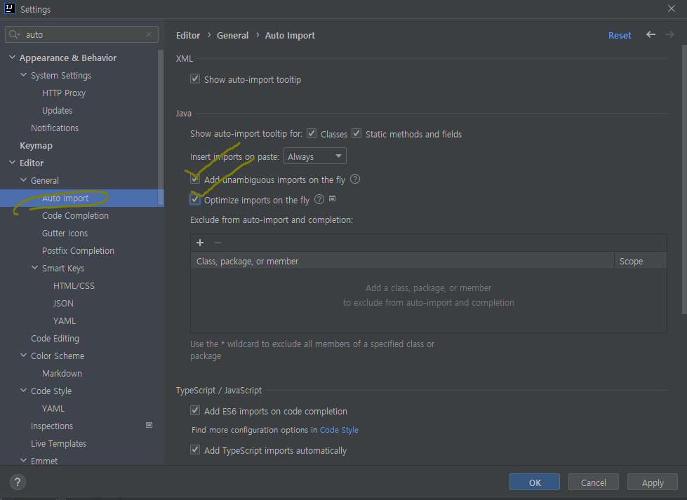 Auto Import메뉴의 Add unambiguous imports on the fly, Optimlze Imports onthe fly 체크